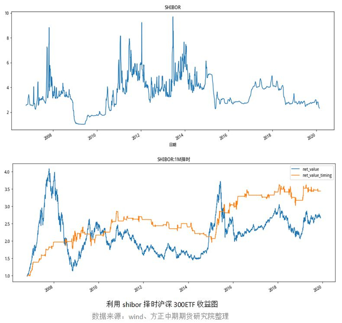 Shibor是上海银行间同业拆放利率,与libor类似。当shibor利率过高时,则表明市场资金面较为紧张,股市大概率下跌,而当shibor利率较低时,则市场资金面供应宽松,流动性充足,股市大概率上涨。2012年“钱荒”时,shibor利率大幅抬升,最高曾触及到9%左右,股市随着而来的是持续下跌行情。择时技术为当Shibor:1M向下突破自己的布林带下轨时买入指数,当Shibor:1M上穿自己的布林带中轨时卖出指数。