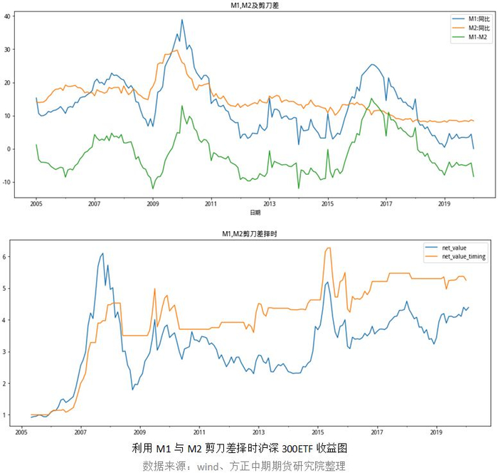 中国将货币供应量划分为三个层次: M0、M1、M2。M0=流通中的货币,M1=M0+单位活期存款,M2=M1+准货币(单位定期存款+个人存款+非存款类金融机构存款 )。所谓M1与M2剪刀差之谜,实质是企业存款活期化。由于内外需萎靡,实体投资回报率下滑,叠加利率下行,企业持币成本下降,存款活期化,从而导致M1M2剪刀差持续扩大。择时技术采用当M1-M2的三月均线上行时买入指数;当M1-M2的三月均线下行时卖出指数。