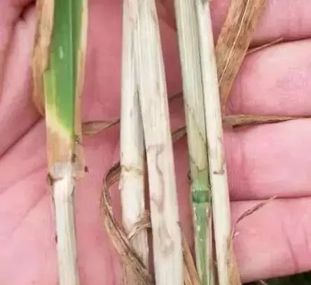 叶鞘染病:麦株基部叶鞘先发病,初生褐色病变,产生1-2cm长的椭圆形病斑,边缘暗褐色,中间灰褐色,后沿叶脉纵向扩展成长条形褐斑,导致病部以上叶片发黄枯死。
