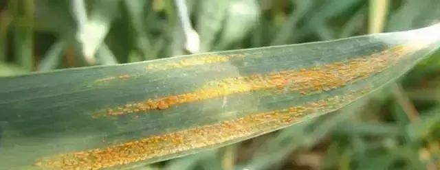 条锈病的孢子堆在小麦穗部和叶片上沿叶脉排列成显著的条斑,颜色为黄色至枯黄色,孢子堆比叶锈病小、气温在5-15℃时,最适宜发育,气温低于0℃时发育受阻,有间歇的小雨和雾露天气可助长发育。
