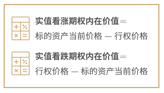 实值期权的内在价值大于零,平值和虚值期权的内在价值等于零。实值期权内在价值的计算方法为: