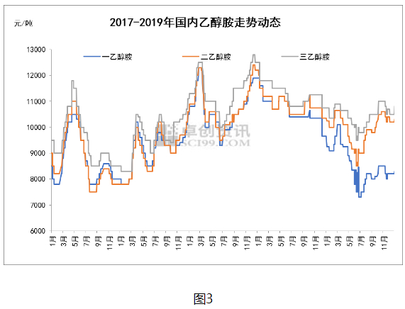 价格方面:2017-2019年,国内乙醇胺价格走势呈震荡下滑明显,近五年间,乙醇胺振幅较大,2017年二乙醇胺桶装价格最高点10500元/吨,2019年二乙醇胺价格最高点10100元/吨,同比下滑4%。