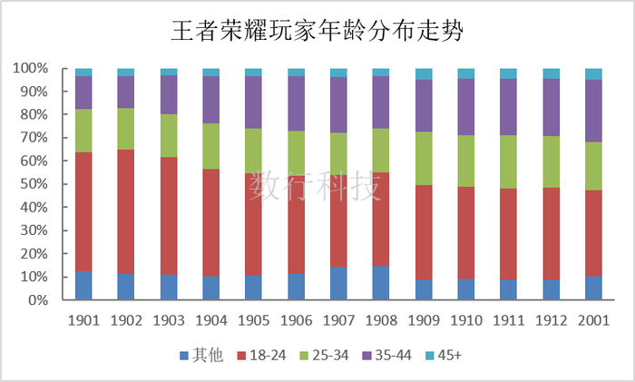 从数行移动大数据来看,18-24岁青年玩家占比一直在下降,目前跌破四成。35-44岁玩家比例增长较快,今年一月份占比已达到27%。王者荣耀玩家的平均年龄在提高。