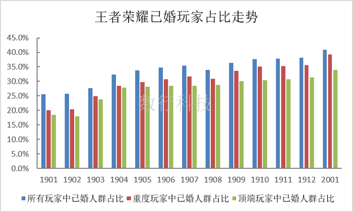 随着80后玩家占比提高,以及第一批90后已步入而立之年,已婚玩家占比提高也是情理之中。从数行移动大数据可得,王者荣耀已婚玩家比例提升较快,今年一份月占比已达到四成。