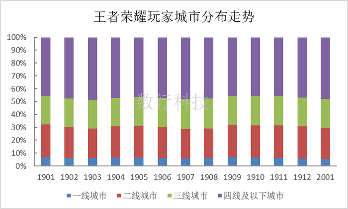 从数行移动大数据来看,王者荣耀玩家城市分布比较稳定。与全国网民分布相比,王者荣耀玩家更偏向三线及以下城市且占比稳步提高,今年一月份占比超过70%。