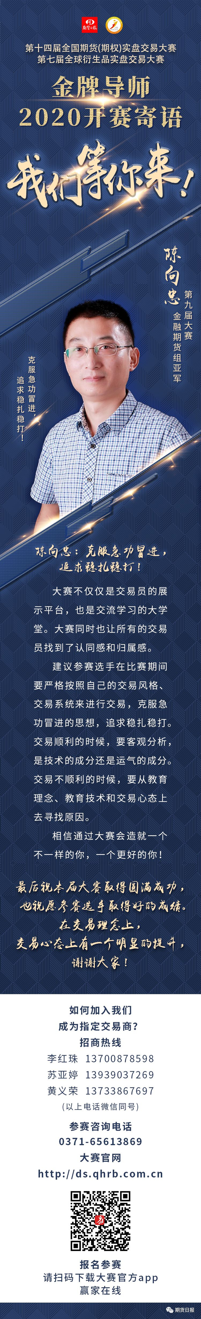 期货日报实盘赛金牌导师、第九届实盘大赛金融组亚军陈向忠为2020年大赛及参赛选手送来祝福: