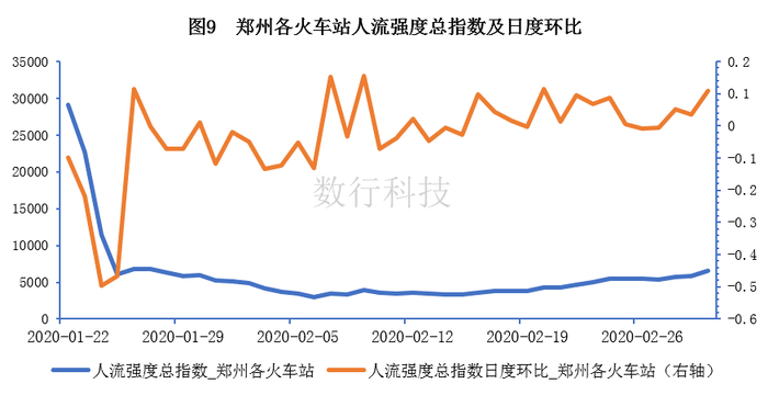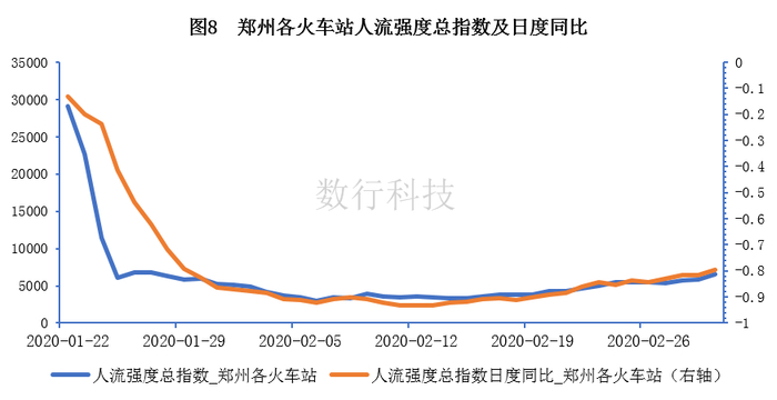 移动大数据同比指标显示,郑州火车站总人流强度同比由月初的-87%上升到了月底的-79%。从日度环比数据看,从2月16号截至3月1号,环比仅有3天为千分位负数,其余皆为正向走势,环比恢复趋势比较明显。