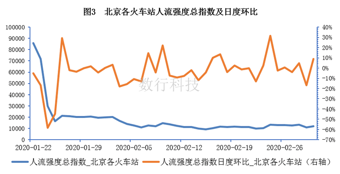 从环比数据看,北京各火车站人流强度在2月23日、24日分别上涨2.32%、31.4%,且一周内未跌出2月份最低点。