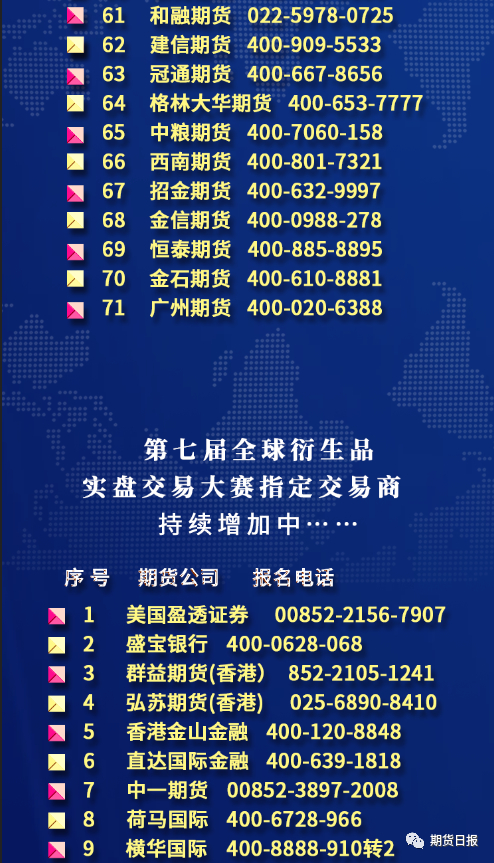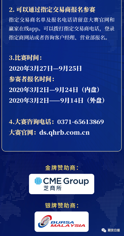 据了解,今年的大赛赛期是3月27日到9月25日。目前,本届大赛已汇聚近90多家指定交易商和包括芝商所、马来西亚衍生品交易所、新交所在内的9家合作者,合作机构数量再创历史纪录。在接下来半年时间里,大赛组委会将与这些合作机构一起,用形式多样的活动,为参赛者做好专业服务,助其在竞技中完善交易系统,提升交易水平。