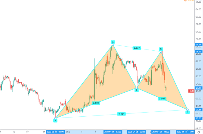WTI期货一小时图中,原油价格在20附近存在强劲支撑,若油价下跌至此处有望形成看涨蝙蝠形态。投资者可以稍加留意。