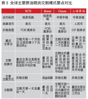 从上述介绍可以看出,每个原油期货合约均有各自的特点。上海原油期货从合约标的、价格类型、交割方式、交割结算价等多个方面与WTI、Brent、Oman的交割模式都有所区别。为方便比较,WTI、Brent、Oman及上海原油期货交割模式要点对比如下,见表5。