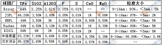 印球品质指标、抗压强度等都差不多,据市场人士反馈库球(KIOCL)的品质最优。与国产球团对比,隐球颗粒度小,粉率比国产球高;铁品位在63%-65%区间内较国产球稍高;但铝指标达2.5%左右,较其他国家偏高。此外,较乌克兰和巴西等国外球团生产国来说,印度距离中国与日本市场的距离较近,运费优势相对较大。