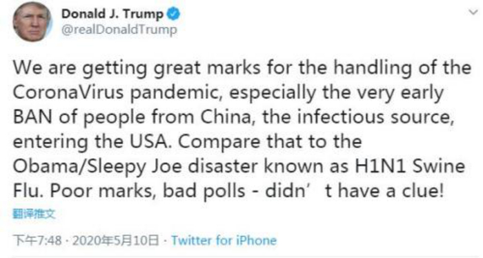 被奥巴马“点名批评”后,特朗普亲自回应了。5月10日,特朗普发推特回击奥巴马,称奥巴马政府简直一无所知,其在H1N1上的应对糟糕,并认为自己在处理新冠病毒问题上取得了巨大成绩。
