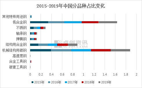 对比2015-2019年中国、日本优特钢的分品种情况来看,碳结钢、低合金钢、合金钢的用量最大,占比也最大。不过中国合金钢的占比明显低于日本,而碳结钢的占比则明显高于日本,显示出中国在高端优特钢品种中产量的不足。