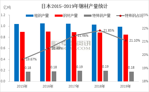 从2015-2019年日本钢铁行业整体来看,近几年日本钢材产量略有下滑,从2015年的0.89亿吨降到了2019年的0.85亿吨。而特钢产量保持较为稳定,致使特钢在整体钢材市场中的占比略有提升。