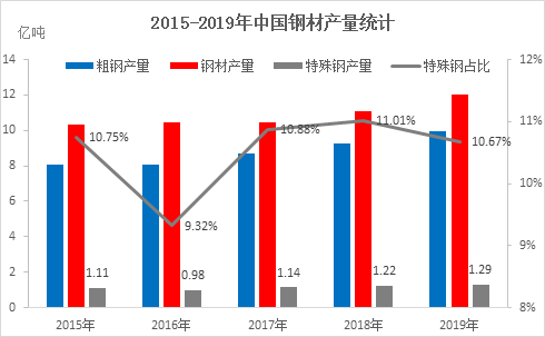 而中国钢材产量有2015年的10.35亿吨增加到了2019年的12.05亿吨,增幅为16.43%,而特钢产量由1.11亿吨增加到了1.29亿吨,增幅16.21%,两者增幅相近,特钢在整体钢材中的占比变化不大。对比来看,日本特钢占比明显高于中国,且发展进入成熟期,整体特钢市场较为稳定,而中国特钢市场仍在呈现较为快速的发展,整体市场变化更为剧烈。