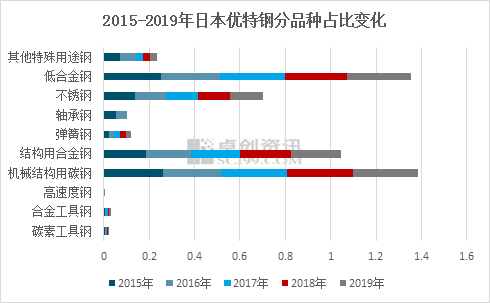从另一方面来看,日本在工具钢以及其他特殊用途用钢中的占比更高,显示出其在特钢领域更深入的发展。