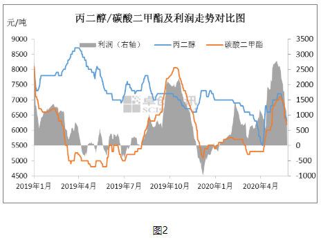 而5月中旬以后,价格相对高位,下游对高价接受有限,新单放量偏弱,供方排货周期缩短,续涨乏力;加之后市新增装置产能释放的利空消息面影响增强,重庆东能装置已于月下旬重启,稳定生产,中盐红四方装置计划月底重启,6月初产出产品,浙江石化装置同样计划于月底试车,供方偏低商谈接单;厂商排货出货后,刚需聚碳阶段性补仓放量,部分持货商对后市预期较差,偏低成本货源套利出货,致使低价在业者心中锚定‘随后商谈中持货商积极出货,下游根据目标价格,持弱观望,少量入市还盘压价,碳酸二甲酯交投重心快速下移,基本回落到碳酸二甲酯第一上涨阶段水平。同时整体利空氛围下,联产产品丙二醇也同样表现下跌行情,导致装置利润大幅回吐,至5月26日,碳酸二甲酯装置利润在863.5元/吨,跌幅在69.04%,装置利润基本回归到涨势开始前水平。