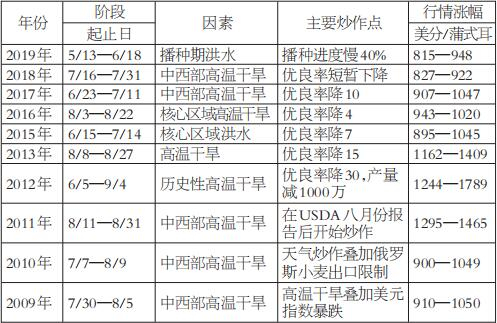 表1是历年夏季天气市统计走势,统计了近年美豆天气市起始日期、核心因素、主要炒作点以及最终行情上涨幅度等信息。可以看到在播种期(7月前)和成熟期(9月以后)的行情相对比较少,最常见的上涨行情发生在7月中旬至8月中旬。生长期的行情往往是由于核心区域高温干旱,带来的涨幅为80美分/蒲式耳至150美分/蒲式耳。另外,在没有非常典型的天气炒作的2014年,7月至8月期间美豆也是以振荡为主。因此,夏季天气市阶段,做多的胜算率较高,但天气市过后则做空的胜算率较高。