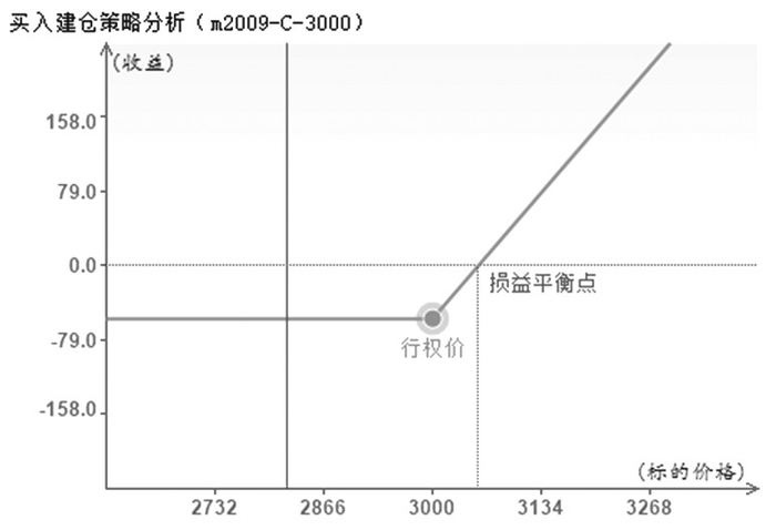 直接做多的策略我们推荐两种,一是直接买入虚值看涨,二是买入期货多头外加卖看跌期权的建仓形式。我们首先分析直接买入虚值看涨期权:图3是M2009-C-3000期权合约到期损益。当前隐含波动率为23%,杠杆比率49.6倍,权利金为565元/手,直接买入看涨期权优缺点都很突出。优点是价格便宜,杠杆比率高,后期如果波动率上升还能赚波动率上升的钱;缺点则是随着到期日的临近,时间价值损耗速度会变快。