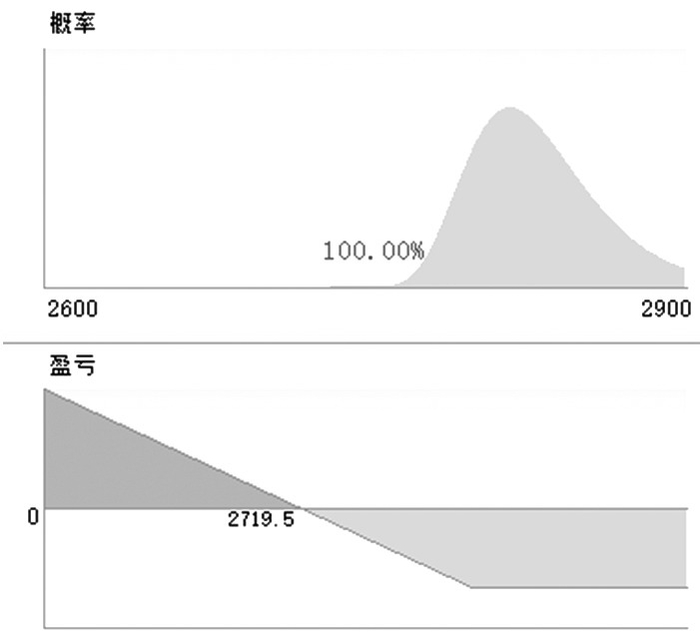 假设8月执行测时豆粕期货价格2850元/吨。由于美豆单产基本定型,价格大幅波动的可能性减小,因此可以预期后期波动率将会下降,因而可以选择卖出期权策略。图5是同时卖出相同数量的行权价为2850元/吨的豆粕看涨期权和看跌期权到期损益图。当价格大于3050或者2644时我们的策略组合才会产生亏损,安全边际十分的好。