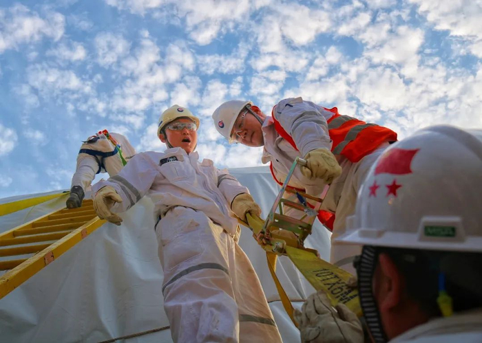 焊接工程师沈楠楠和焊工班长耿建成,相拥着与“海洋石油119”合影。过去的近两年里,焊接技术和技能团队紧密协作,先后攻克130毫米超大厚板焊接、高强铸钢焊接等多项关键技术,在下塔体集成板焊接中,他们组成攻坚小组进行指导监控,每天上下攀爬高度超过100多层楼,确保了110多米的超长环焊缝无损检测一次合格。