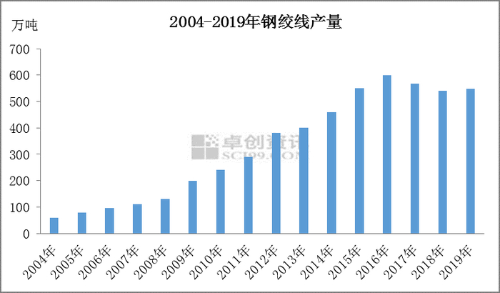 从图中可以看出,2004-2016年国内钢绞线产量增速较快,其中2004年钢绞线产量仅60万吨,而到2016年钢绞线产量达600万吨,年均增速约21.15%;主要是国内公路、铁路等高速发展,对钢绞线的应用增加,推动钢绞线市场快速发展。从2017年开始,钢绞线产量稍有回落,其中2019年产量约550万吨,较2016年减少8.33%。