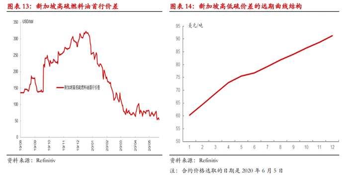市场也对低硫燃料油供需变化很快地做出了反映,低硫燃料油的裂解价差从此前高点30美元/桶下降至仅有5-6美元/桶。低硫燃料油的现货升水和月差也是大幅下降,低硫燃料油的远期曲线由此前的远期贴水结构转变成为远期升水结构。曲线结构本身是受原油市场的影响更大一些。市场表现直接体现了低硫燃料油市场由此前的供不应求变成了供需弱平衡,甚至是有一定程度的过剩。当然目前弱平衡的局面在一定程度上是因为船燃需求仍处于被压制状态。即使全球经济恢复至疫情前水平,低硫的裂解和月差很难再回到2020年初的水平,因为产能瓶颈已经在逐步解决。