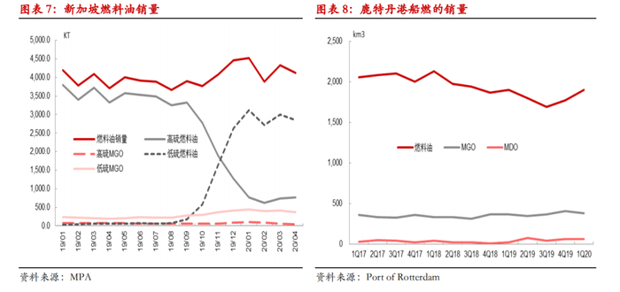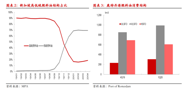 鹿特丹港口作为欧洲第一大船用油加注港口,高低硫切换的比例并没有像新加坡变化那么显著。2019年4季度,高硫燃料油和低硫燃料油(含超低硫燃料油)的比例分别为39%和61%。至2020年1季度,高硫和低硫的比例分别为32%和68%。高硫燃料油下降的幅度仅是从39%降至32%。