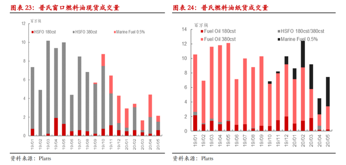 在低硫下跌的同时,高低硫的价差呈现出同步下降。高低硫切换在19年4季度末接近尾声,意味着高硫的需求很难出现进一步下降。由于低硫已经占据船供油的主导地位,新冠疫情对需求端的冲击则是更加充分地体现在低硫上。供需失衡直接作用于低硫,而高硫则是依靠加装脱硫塔的船只提供了稳定的需求。高硫的需求预计随着脱硫塔加装船舶数量的增加会进一步上升,但是升幅预计较为有限。