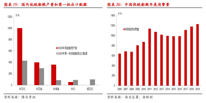 国内生产低硫燃料油的主力炼厂是中石化和中石油,两者合计的市场份额高达80%。2020年4月底,商务部下达2020年第一批低硫船用燃料油出口配额。首批配额的安排为:中石化429万吨,中石油295万吨,中海油90万吨,中化90万吨,浙石化100万吨,总计约1000万吨。如果第一批配额提前被用完,年内可能会下发第二批配额,估计在500万吨。从配额发放量来看,解决国内低硫供应依赖于进口是第一位的。如果国内保税船加油的需求量大幅上升,配额同比上升的可能性才更大。根据2020年1月22日财政部、税务总局、海关总署联合发布《关于对国际航行船舶加注燃料油实行出口退税政策的公告》,出口退税针对的对象是国际航行船舶在我国沿海港口加注的燃料油。没有出口退税,炼厂生产低硫燃料油的动力将会大打折扣。因此,国内炼厂的低硫燃料油供应量将受制于保税船燃需求的总量。成为全球船加油中心是一条漫长的路,并不会简简单单因为价格更为低廉就一定能够吸引到船加油客户东移,而是综合服务能力。我们预计国内保税船燃需求量将呈现稳步上升的趋势,而非爆发式增长。
