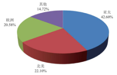 亚太地区工业氢气生产量居全球首位,北美地 区紧随其后(图 4)。2017 年亚太地区工业氢气的生 产规模为1 071.36 亿美元,北美为555.80 亿美元,而欧洲则为 517.57 亿美元。中国和印度等亚太发展 中国家经济快速增长,由此带来了亚太地区对氢能 等清洁能源的强劲需求。