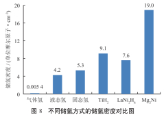 安全、高效的储运氢技术是实现氢能实用化的 关键 [6-7]。氢能的存储方式主要包括低温液态储氢、 高压气态储氢、固态储氢和有机液态储氢等,不同 的储氢方式具有不同的储氢密度,其中气态储氢方 式的储氢密度最小,金属氢化物储氢方式的储氢密度最大(图 8)。