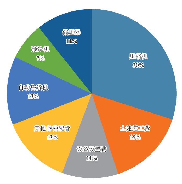加氢站的主要设施包括储氢装置、压缩设备、 加注设备和站控系统等。目前一个加氢站的建设成 本介于 200 万~ 500 万美元,其中压缩机成本最高, 约占总成本的 30%(图 9)。中国加氢站的建设成本 相对较低,介于 200 万~ 250 万美元(35 MPa 加氢 能力)。因此,需加快工业氢气压缩机国产化进程, 降低加氢站建设成本,促进氢工业的发展。