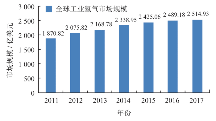 全球氢工业发展迅猛,市场规模从 2011 年的 1 870.82 亿美元增长到 2017 年的 2 514.93 亿美元,