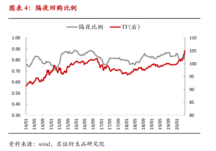 在货币市场借入资金去二级市场上买债是一种比较常见的加杠杆交易方式,当资金利率低和投资者对市场比较乐观时会倾向于借入隔夜资金进行债券交易博取回报,当隔夜回购占总回购的比例越高时,表明借隔夜加杠杆交易的资金越多,一定程度上可以体现投资者的情绪,由于隔夜回购量的变动幅度较大,为了避免噪音过多,我们将原始数据取20日移动平均。