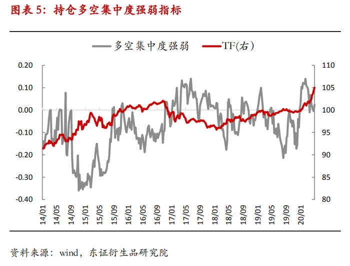 从图表上来看,集中度强弱指标大部分时候为负值,可能与大机构大部分时候以国债期货作为套期保值工具,而投机属性更强的散户和小机构则利用国债期货投机交易获利有关,所以空头的力量比较集中。