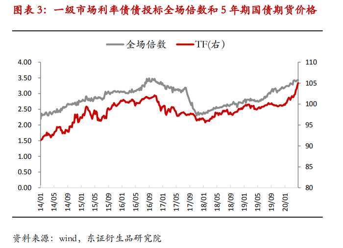 国债和政金债的一级市场投标全场倍数可以体现配置盘的情绪,如果投标倍数较高则说明市场情绪较好。市场比较冷清时投资者投标的意愿不是很强,全场倍数则会较低。有时一天有不止一只的利率债发行,我们以发行债券的发行规模占当天全部发行规模的比例为权重进行加权,计算每日的平均全场倍数。