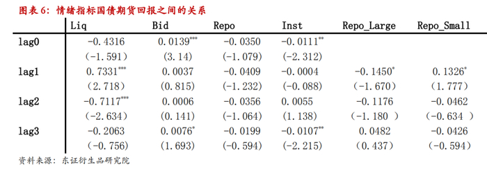 至此我们得到4个具有经济含义的情绪指标,他们与国债期货收益率之间是否存在稳定的关系需要进行进一步的验证。将每个指标周度的变化值与5年期国债期货周度收益率进行回归(数据无重叠),分别检验同期、滞后一期到滞后三期的情况,统计如下表所示。