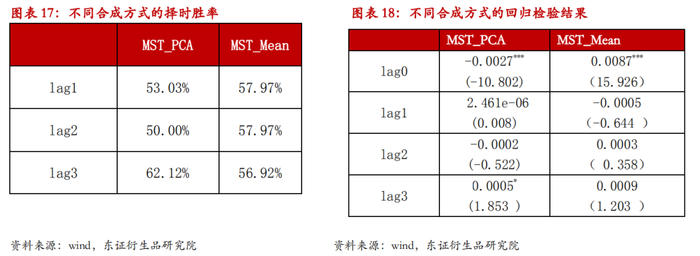 得到四个技术指标之后,我们希望获得一个综合的技术指标,指标合成的方法同样考虑主成分分析和等权平均。计算两种合成方式获得的综合指标的择时胜率和与国债期货周度回报进行回归的结果。结论是PCA合成的综合技术指标与三周后的国债期货回报之间存在显著关系,且择时胜率较高。虽然等权合成指标对滞后一期和两期的择时胜率较高,但回归结果不显著。所以我们选择用PCA的方法将四个技术指标进行合成,得到市场情绪的技术指标MST。MST与同期国债期货回报之间是显著负相关,而与3周后的回报显著正相关,这表明该指标具备一定的提示拐点的作用,也正是我们最关心作用。