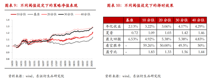 由于从2014年至2020年4月国债期货大部分时候处于牛市,所以数据本身略有偏差,如果考察指标正向变动和收益率之间是否存在正相关的说服力不够强,我们在指标极端负向变动时选择做空,其他时候做多,将策略表现与一直做多进行对比。分别考察当阈值为10分位数至40分位数的情况。结果如下表所示,加上MS指标之后的策略表现均优于基准。统计设置不同阈值时的看空胜率与盈亏比,发现当以10分位数为阈值时的看空择时胜率和盈亏比均有明显的提升,40分位数为阈值时策略年化收益更高是因为触发信号的次数更多。