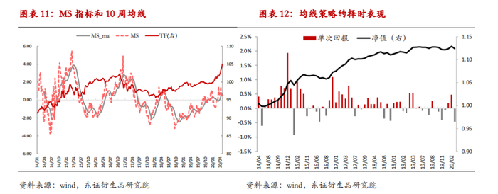 除了通过设定阈值来检验指标大幅变动时的择时效果以外,另外一种发出信号的方式是借助均线。情绪指标本身的波动较大,我们对其取10周移动平均,当MS指标上穿均线时做多,下穿均线时做空。做多胜率77.42%,做空胜率61.29%,整体择时胜率69.35%, 盈亏比1.44。