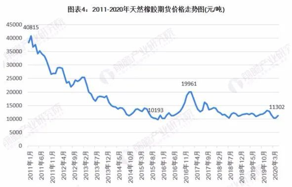 2011-2020年中国天然橡胶期货市场价格整体呈现下降态势,其中高峰出现在2011年,价格在40851元/吨,随后中国天然橡胶期货价格一路下跌,2020年6月,天然橡胶期货价格在11302元/吨附近。