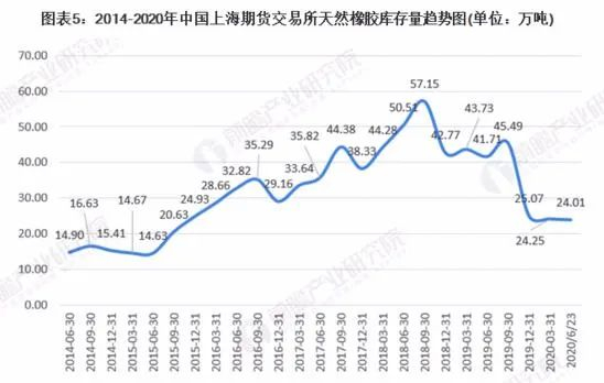 库存方面,天然橡胶从2018年的57万吨高位一路下滑,截至2020年6上期所库存为24.01万吨。受公共卫生事件影响,全球悲观情绪蔓延,橡胶需求抑制,胶价大幅走跌,但国内3月进口看似未受影响,进口量不跌反涨。主要原因一是国内贸易商与国外加工厂三四月份订单,多为年前签订,二是适逢国内公共卫生事件形势严峻,二月份部分到港的货物延迟到3月份才报关。在这两个因素的影响下,中国天然橡胶的库存量维持在相对低位。