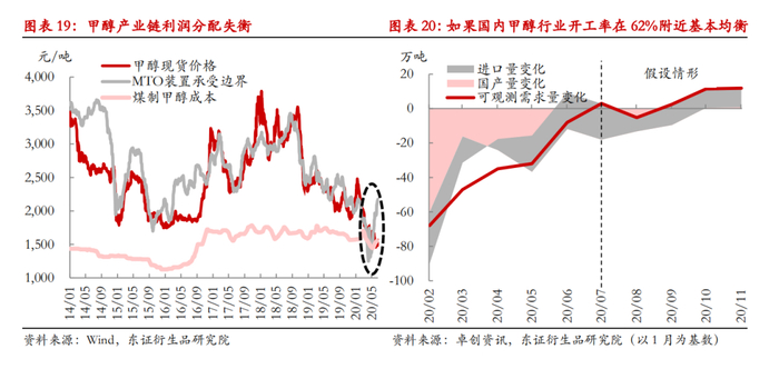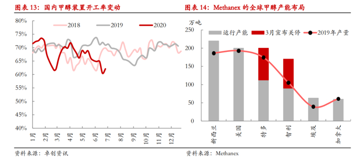 疫情并未打断年内新增扩能的步伐,这将加剧存量产能的成本竞争。自4月以来,高成本产能已经出现了现金流微亏的情形,我们观察到南美地区合计350万吨产能停产,中国西南地区的天然气制甲醇以及河南等地的中小型煤制甲醇也已在承受边界,以上高成本产能的减停产有望实现新旧产能替换的效果。即便国内高成本产能出清不会一蹴而就,装置检修力度加大或是国内甲醇行业开工率维持在62%以下也有助于市场再平衡。