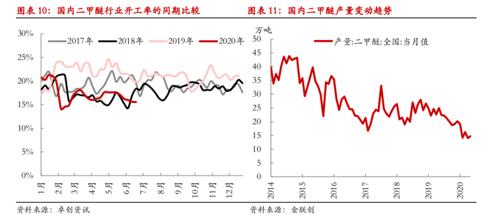 近年来二甲醚行业本身已是在夹缝中生存,二甲醚掺混销售受到政策层面的严厉打压。疫情之下,全国餐饮行业受到重创,二甲醚需求也难免受到拖累。国内不同统计口径的二甲醚产量差异较大,我们从定性的角度可以总结出一些共性:首先,2月是国内二甲醚需求的低点,其后二甲醚行业环比有所修复,但恢复速度略显迟缓;其次,二甲醚产量有逐年走低的趋势,除非二甲醚产业政策出现重大调整,否则二甲醚产销状况同比缩减的趋势难以扭转。