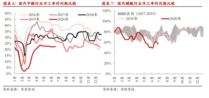 受新冠疫情影响,甲醛、醋酸等传统化工需求同比大幅下滑。上半年国内甲醛与醋酸行业的开工率同比明显偏低,并且即便进入后疫情阶段,甲醛与醋酸需求的恢复也较为缓慢。