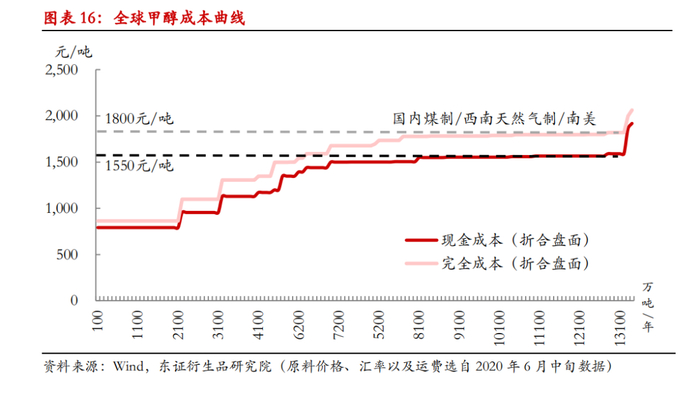 从全球范围来看,中国内地煤制甲醇、中国天然气制甲醇以及南美地区的甲醇装置处于成本曲线偏高的位置,值得作为边际产能重点关注。