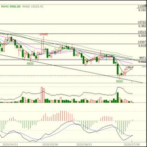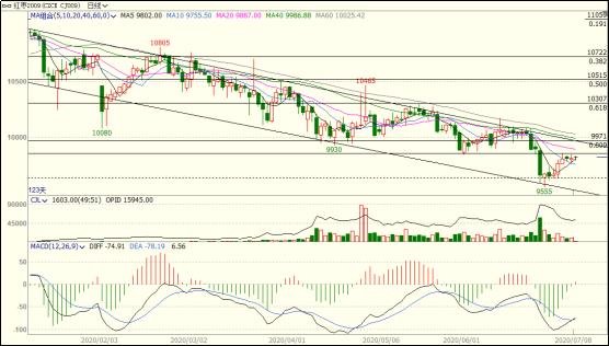 受疫情引发的供大于求的影响,红枣期货整体处于下跌趋势之中,之前红枣在跌破前期9845元/吨的低点的支撑之后,价格在下跌通道下沿得到支撑,但是近期的反弹在前期9845元/吨的低点受阻。红枣期货成交量、持仓量均大幅下降,市场量能不足,反弹难以持续。均线系统整体上长期均线位于上方,短期均线位于下方,但是5日均线上穿10日均线,短期走势偏强。MACD指标有形成金叉的迹象,即将给出买入信号。