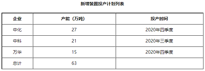 2020年下半年,环氧乙烷将有63万吨新增环氧乙烷投产,其中万华化学自用为主,中科和中化自用外销均有。华南区域较为集中,届时环氧乙烷华南资源将有明显的放缓迹象。